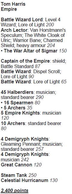 Raf: I love Tom, and he will have a very clear idea of how he will beat each and any of the other lists at this event (Tom is always sure of such things). He will understand if I say I haven’t got that much to say about this list – it’s an Empire list, and, with the best will in the world, they all look the same to me. Its such a traditional Empire list that I have to believe that people bringing the big guns will be ready to deal with it…