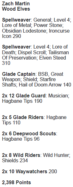 In 4th: Zach. Just outside the podium, but all the “wood elf” armies have several strong matchups – in practice, though, I expect at least one of them to fall notably lower than this after a bad run.